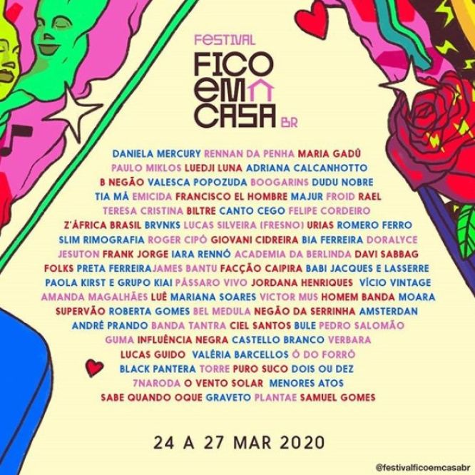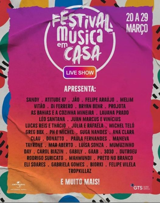 Artistas musicais de todos os ritmos se juntaram e estão fazendo lives com suas apresentações desde a última sexta-feira (20) pelo Festival Música em Casa. Os shows on-line já contaram com Sandy e Júnior, Felipe Araújo, Bruno (da dupla Bruno e Marrone), Atitude 67, Michel Teló, Projota e Zeeba e na programação desta segunda-feira (23) estão Di Ferrero, OutroEu e Vitão, começando sempre às 19h00 (horário de Brasília) com duração de meia hora de cada artista. Mais informações pela página no Instagram .