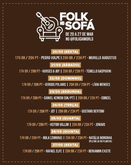 Até o dia 27 de março, a brasileira Maísa Cachos vai organizar um festival de folk, que reúne 16 artistas do gênero. As apresentações serão transmitidas pelo perfil do Instagram. Entre os artistas confirmados está Natália Noronha, da banda Plutão Já Foi Planeta, Gustavo Bertoni, da Scalene e o cantor britânico Daniel Kemish. Mais informações pela página no Instagram .