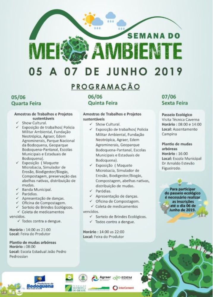 O evento inicia na quarta-feira (05), a partir das 8h, na Escola Estadual João Pedro Pedrossian, com o plantio de mudas arbóreas e seguirá, das 14h às 21h, na Feira do Produtor, com amostras de trabalhos e projetos sustentáveis da Policia Militar Ambiental, Fundação Neotropica, Agraer, Edem Agrominerais, Parque Nacional da Serra da Bodoquena, Geoparque Bodoquena-Pantanal, e das escolas municipais e estaduais do município.