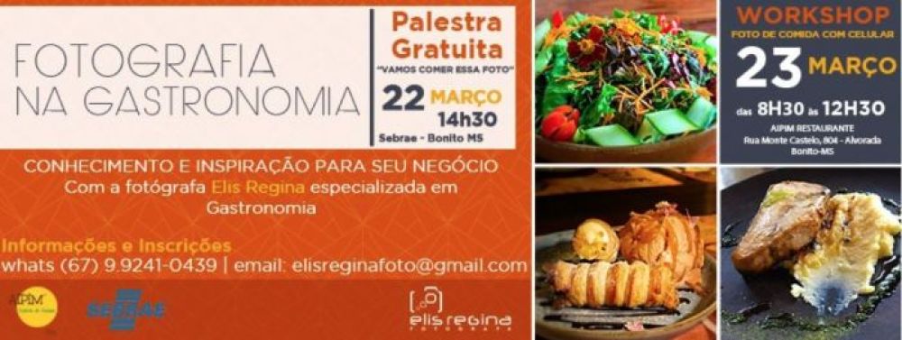No dia 22 de março acontece a palestra "Vamos comer essa foto?", evento gratuito e realizado no auditório do Sebrae de Bonito. Elis Regina vai falar sobre a importância da fotografia para o negócio de gastronomia. Uma boa imagem pode mudar por completo a percepção de como o cliente vê uma empresa, seja na apresentação do cardápio ou nas redes sociais.