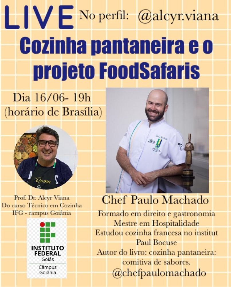 O Chef Paulo Machado e o Prof. Dr. Alcyr Viana, do curso Técnico em Cozinha do Instituto Federal de Goiás – campus Goiânia realizam na próxima terça-feira (16), às 19h, horário de Brasília, a live “Cozinha Pantaneira e o Projeto FoodSafaris”.
