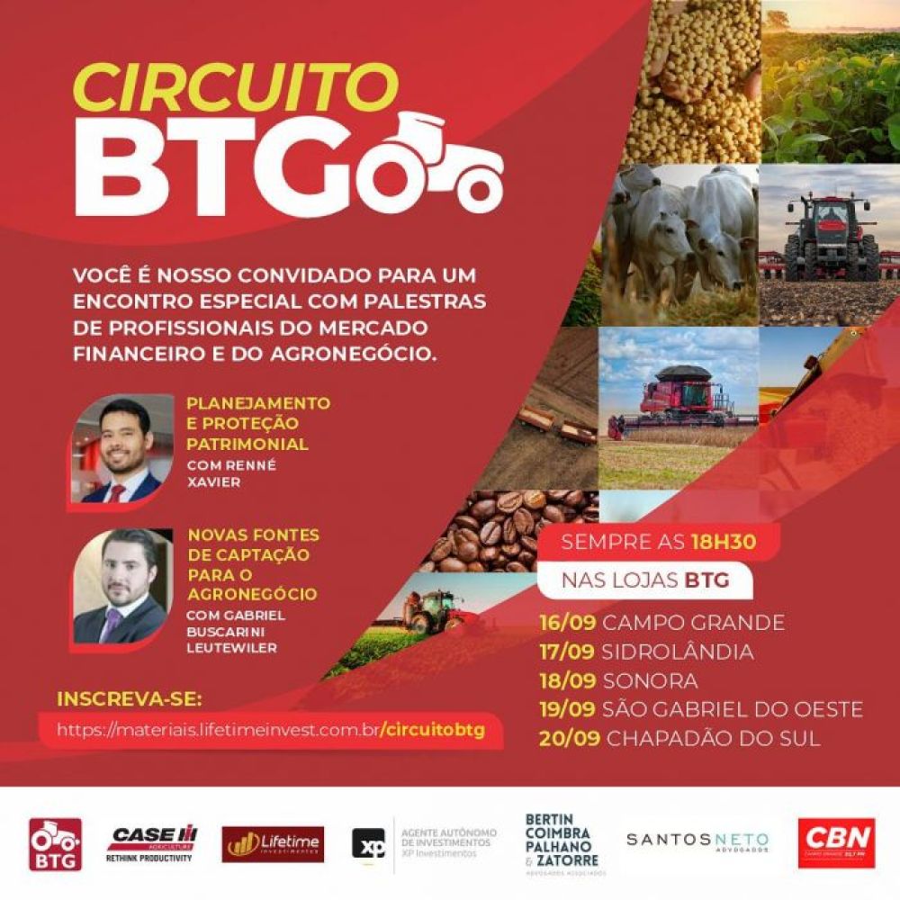 De 16 a 20 de setembro, os profissionais do agronegócio de Mato Grosso do Sul terão uma oportunidade única de adquirir conhecimento, fazer networking e aprender como expandir seus negócios com especialistas na área. O Circuito BTG será realizado em cinco municípios: Campo Grande, Sidrolândia, Sonora, São Gabriel do Oeste e Chapadão do Sul.