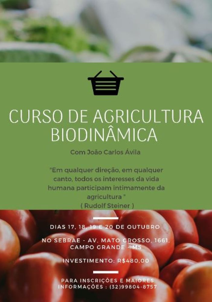 Entre os dias 17 e 20 de outubro, a Sebrae realiza o curso de “Agricultura Biodinâmica” na Capital. O objetivo do curso é mostrar os diferentes métodos desse tipo de cultivo, que não utiliza adubos químicos, venenos herbicidas, fungicidas ou larvicidas, sementes transgênicas, antibióticos ou outros agrotóxicos. Além disso, disponibiliza os recursos naturais a favor do agricultor gerando saúde, ritmo e consciência de forma a aproveitar melhor seu tempo de vida livre.
