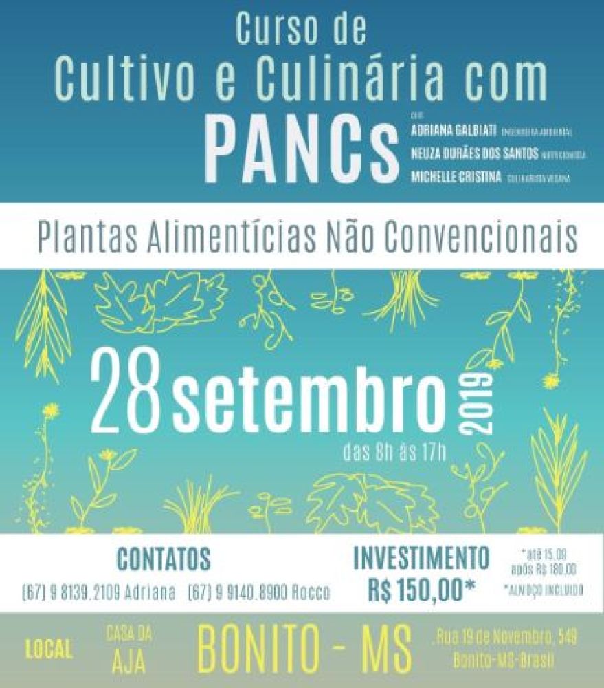 O curso de Cultivo e Culinária com Plantas Alimentícias Não Convencionais (PANC) acontecerá no dia 28 de setembro de 2019, das 8:00 às 17:00, e propõe inspirar a criatividade e intuição na hora de preparar alimentos no dia-a-dia, levando em conta os ingredientes que a natureza oferece para uma alimentação saudável, saborosa e amigável ao meio ambiente.