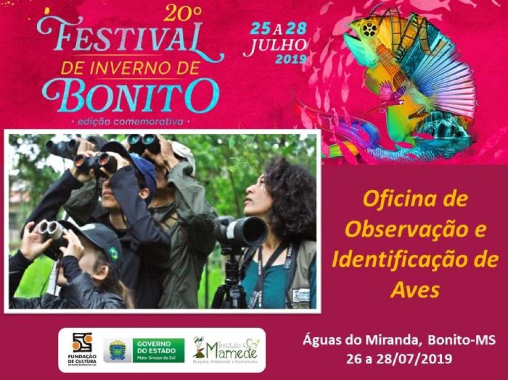 O Instituto Mamede de Pesquisa Ambiental e Ecoturismo, em parceria com a Fundação de Cultura de Mato Grosso do Sul, promove nos dias 26 e 28 de julho, em Bonito, a oficina "Observação e Identificação de Aves".