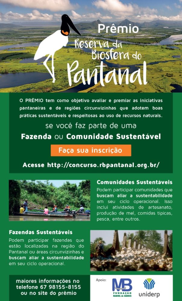 O Prêmio Reserva da Biosfera do Pantanal está com inscrições abertas para o envio de trabalhos que mostrem ações de fazendas e comunidades pantaneiras que conciliam a produção regional com preservação, fortalecendo o equilíbrio econômico, social, cultural e ambiental. Os interessados podem se inscrever, gratuitamente, até o dia 20 de março.