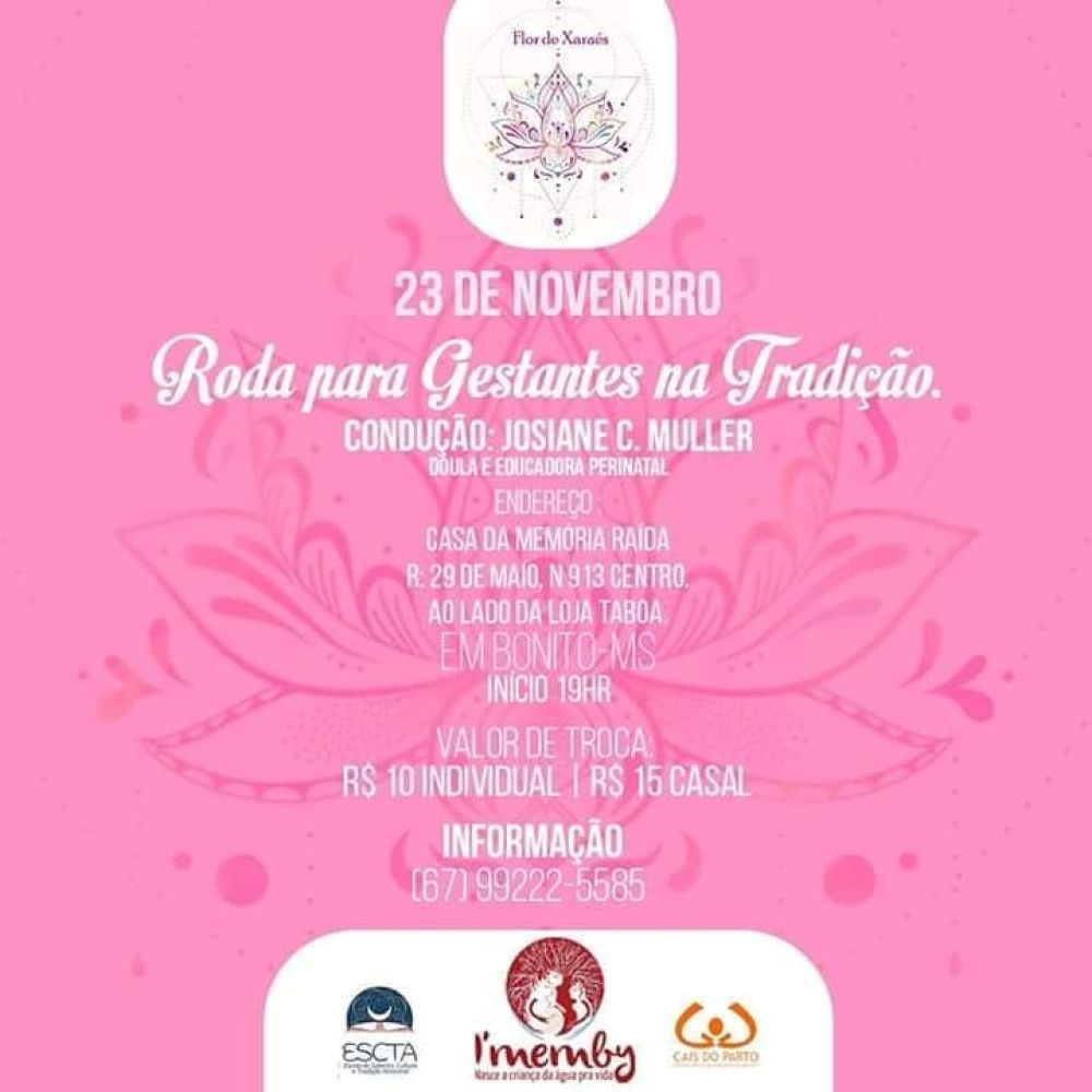 Neste sábado (23), as gestantes de Bonito podem participar da Roda de Gestantes na Tradição realizada pelo projeto Flor de Xaraés, em parceria com a ONG Centro Ativo de Integração do Ser (C.A.I.S.) do Parto, pela Escola de Saberes, Cultura e Tradição Ancestral (ESCTA) e I'memby Parir e Nascer em Plenitude - Parteira e Doulas Tradicionais .