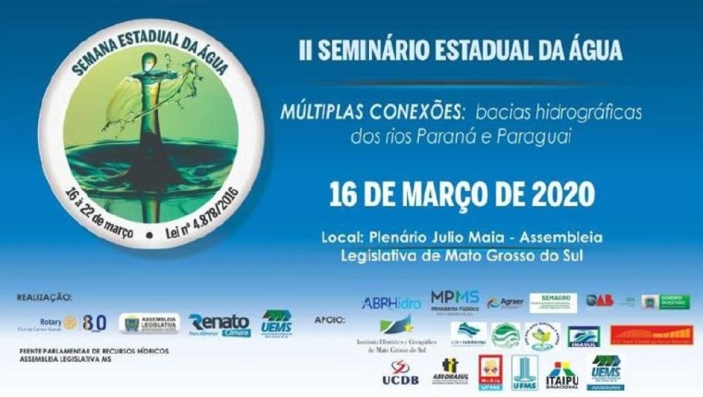A Assembleia Legislativa de Mato Grosso do Sul, com apoio do Ministério Público de Mato Grosso do Sul (MP/MS) e Universidade Estadual de Mato Grosso do Sul (UEMS), realiza a segunda edição do Seminário Estadual de Água, em comemoração à Semana Estadual de Água 2020, onde será discutido as bacias hidrográficas dos rios Paraguai e Paraná.