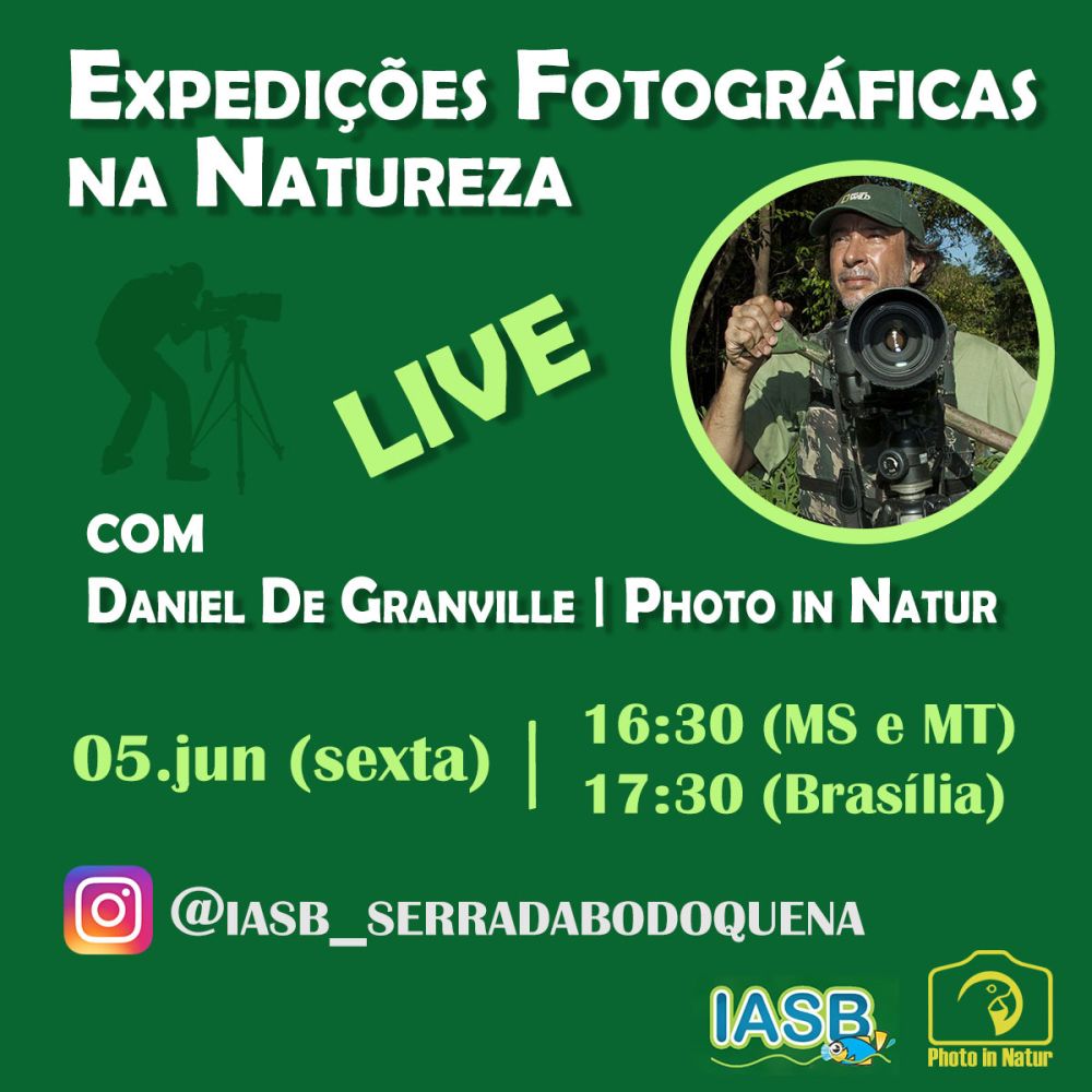 Encerrando o circuito de lives do Instituto das Águas da Serra da Bodoquena (IASB) em comemoração à Semana do Meio Ambiente, o fotógrafo Daniel De Granville e a bióloga Liliane Lacerda irão bater um papo sobre os bastidores de uma expedição fotográfica na natureza e como os atrativos turísticos podem se adequar para receber clientes com este perfil.
