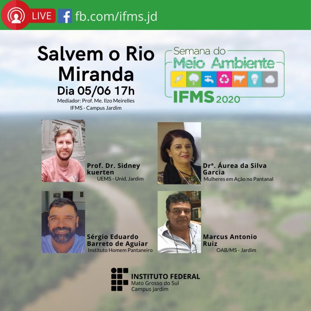 O Instituto Federal de Mato Grosso do Sul – Campus de Jardim – realizará nesta sexta-feira (5), às 17h, horário local, a live “Salvem o Rio Miranda”.