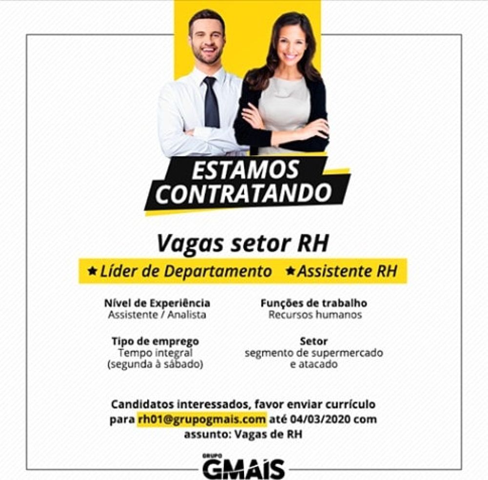 Com vagas de Líder de Departamento e Assistente RH, os candidatos interessados devem enviar currículo para o e-mail rh01@grupogmais.com até esta quarta-feira (04) com assunto "Vagas de RH".