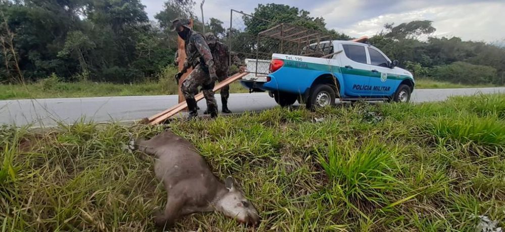 Policiais Militares Ambientais de Bonito receberam um comunicado com informações de que na rodovia MS 178, no município, a 30 km da cidade, havia uma anta (Tapirus terrestris), que estava ferida gravemente à margem da rodovia.