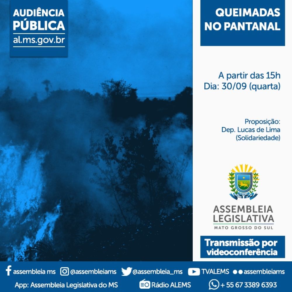 A Assembleia Legislativa de Mato Grosso do Sul (ALEMS) realiza na próxima quarta-feira (30), a partir das 15h, audiência pública por videoconferência para debater ações contra as queimadas na região do Pantanal.