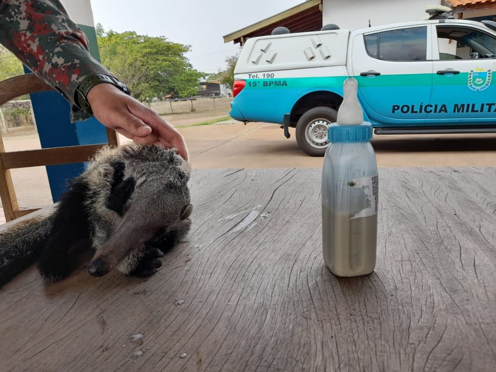 Policiais Militares Ambientais de Anaurilândia (MS) realizaram na última segunda-feira (23) o resgate de um filhote de tamanduá-bandeira (Myrmecophaga tridactyla) à margem da rodovia MS 395, a 10 km da cidade, cuja mãe tinha ido a óbito, vítima de atropelamento. Quando os policiais chegaram ao local, o filhote estava junto ao corpo da mãe morta.