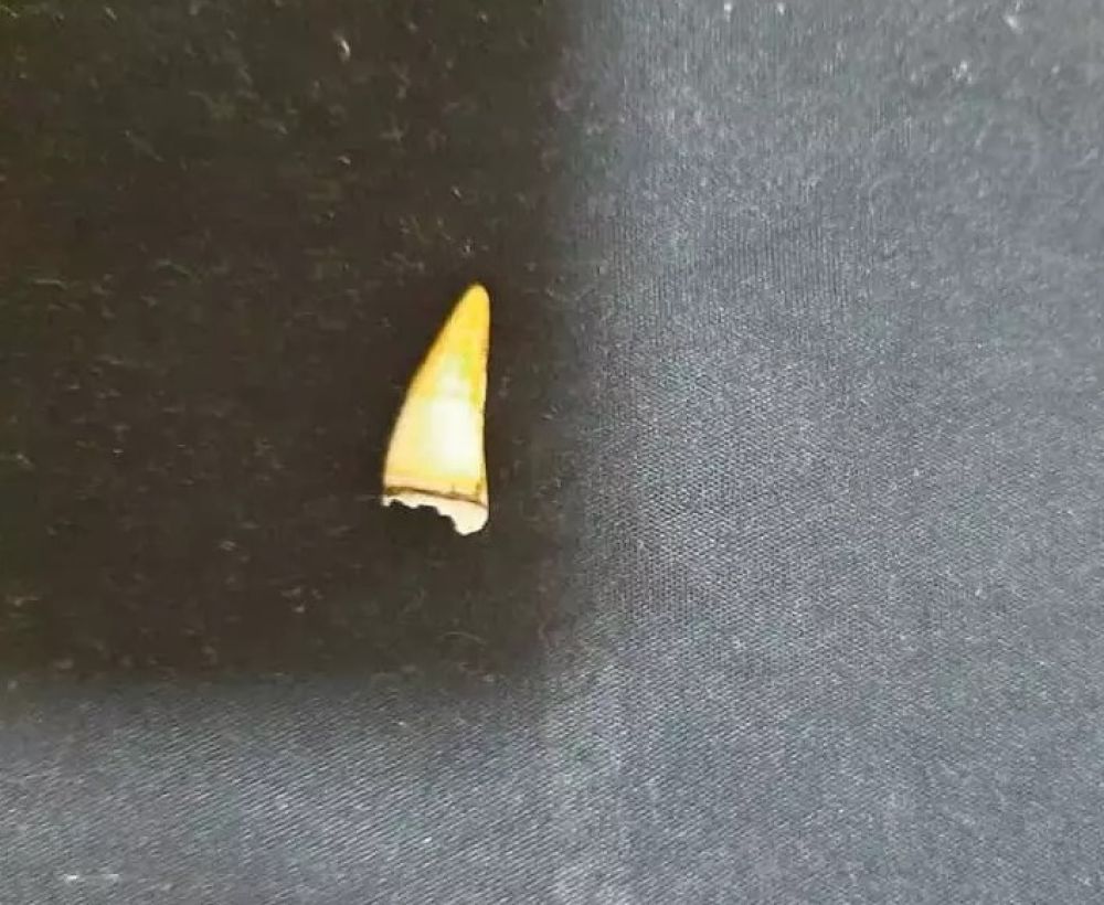 Depois do susto, o que ficou foi o dente do bicho, preso ao aparelho de filmagem.