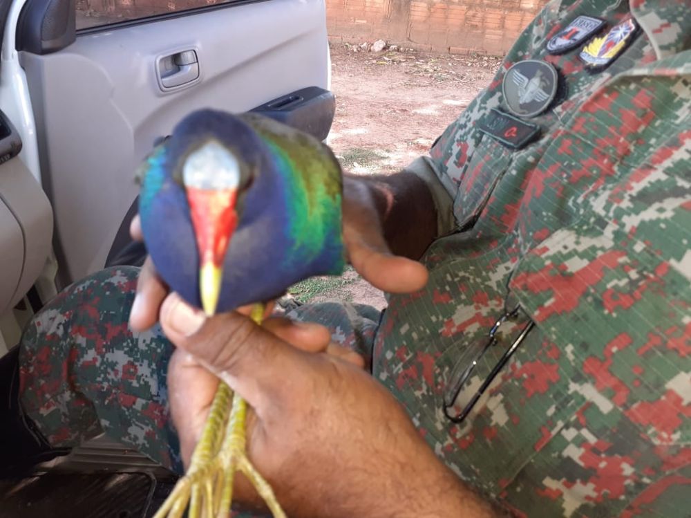 Os policiais foram ao local e verificaram que a ave tratava-se de um frango-d’agua ( Porphurion martinicus ) e estava com a asa ferida. A ave foi encaminhada para atendimento veterinário.