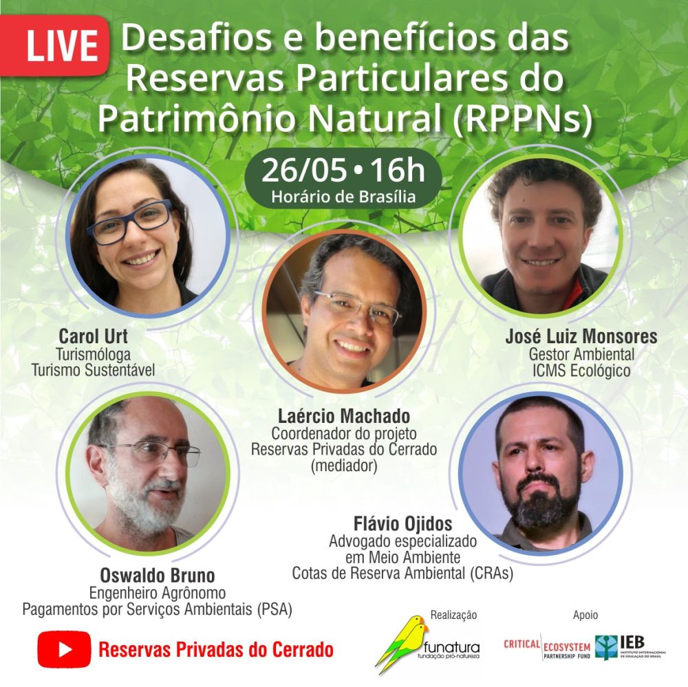 A Fundação Pró-Natureza (Funatura) realiza nesta terça-feira (26), a partir das 16 horas (horário de Brasília) a Live "Desafios e benefícios das Reservas Particulares do Patrimônio Natural (RPPNs).
