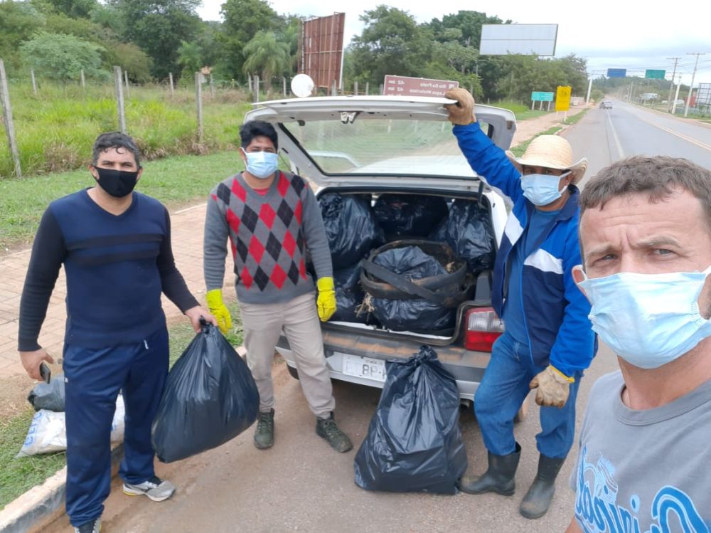Foram retirados 15 sacos de lixo de 100ml, sendo recolhidos materiais como garrafas PET e vidro, sacolinhas plásticas, papelão, latinhas de bebidas, máscaras e muitas embalagens de salgadinhos e biscoitos.