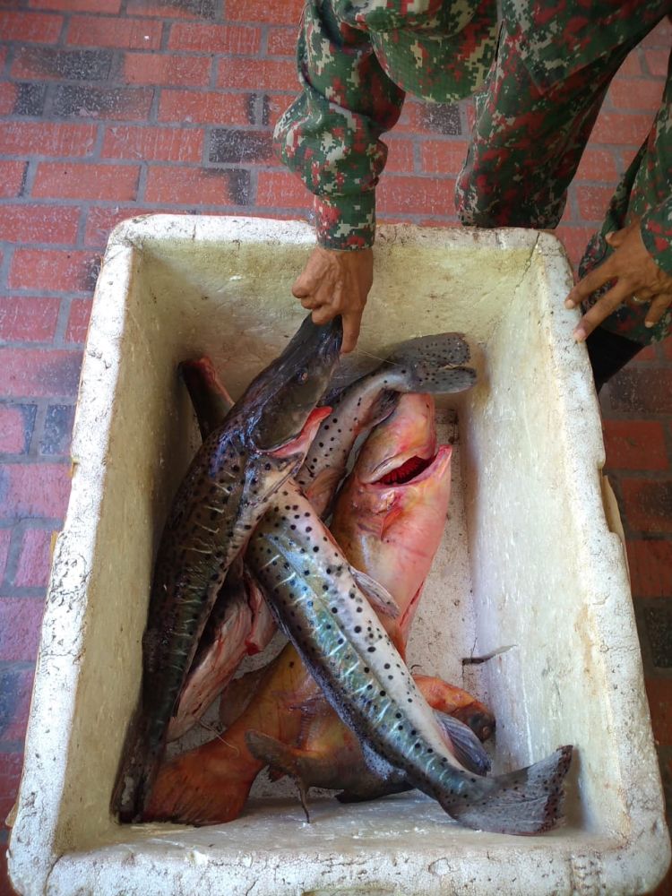 Quando a PMA acendeu os holofotes para a abordagem dos pescadores que estavam em uma embarcação de madeira, com motor de popa, um deles jogou uma rede de pesca no rio ao verificar que era uma equipe policial. Na canoa havia cinco exemplares de pescado das espécies jaú, pacu e pintado, pesando 28 kg, que os infratores tinham capturado, entre eles exemplares fora da medida permitida e ainda com sinais da captura pela rede de pesca (petrecho proibido). O pescado, o barco e o motor foram apreendidos.
