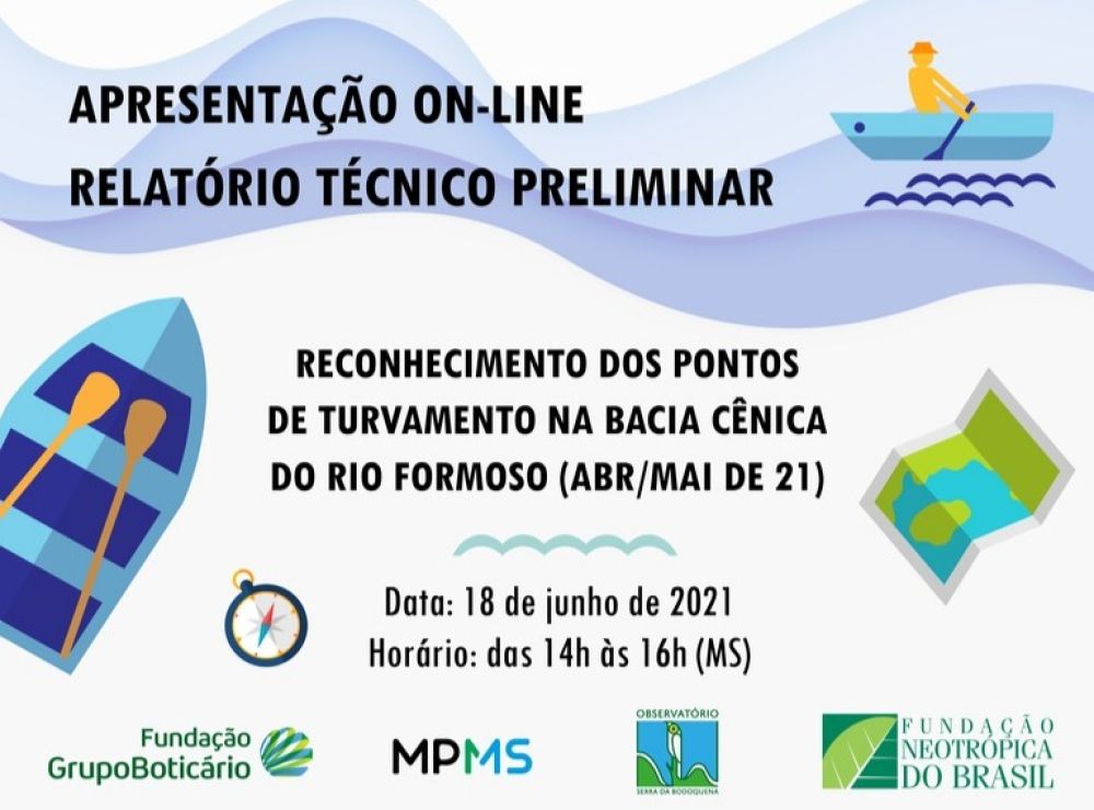 Na próxima sexta-feira (18), a Fundação Neotrópica do Brasil (FNB), organização não governamental sem fins lucrativos, realiza a apresentação do Relatório Técnico Preliminar sobre o “Reconhecimento dos Pontos de Turvamento na Bacia Cênica do Rio Formoso”. A apresentação acontecerá de maneira remota (on-line), destinada para todos os pesquisadores, gestores públicos e sociedade civil de Mato Grosso do Sul.