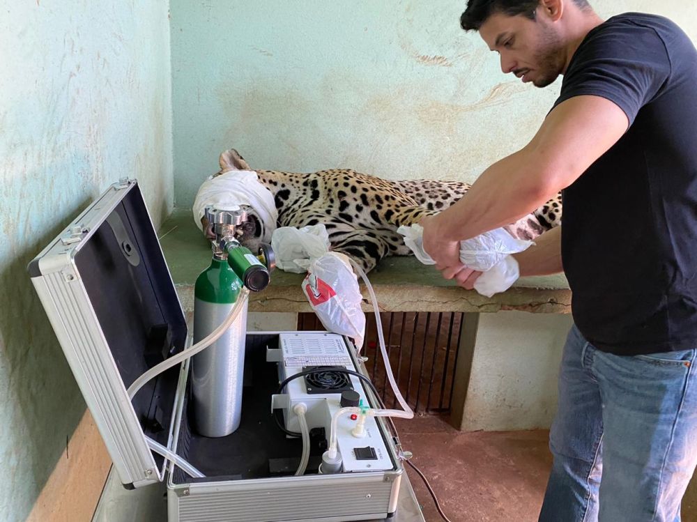 O tratamento de ozonioterapia é feito em parceria com a Universidade Federal de Mato Grosso do Sul e está sendo ministrado pelos professores Breno Fernandes Barreto e Verônica Borges Babo, que acompanham a evolução da saúde do animal. Além das feridas nas patas, a onça estava muito debilitada e desde que chegou ao CRAS tem recebido alimentação balanceada e já ganhou cerca de 8 quilos.
