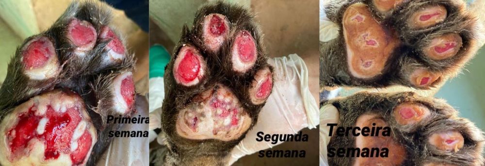 A onça, um macho com cerca de dois anos de idade, vem recebendo tratamento com aplicações de ozônio que tem propriedades cicatrizantes e anti-inflamatórias e o progresso dos ferimentos é visível.