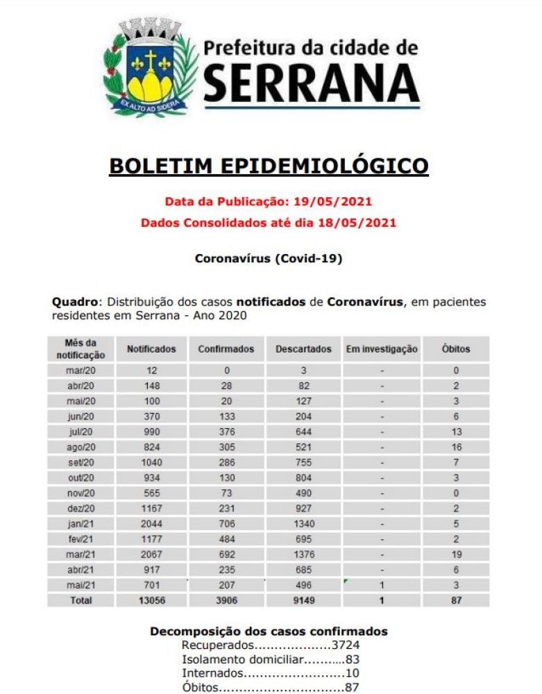 Boletim epidemiológico divulgado pela Prefeitura de Serrana (SP) no dia 19 de maio revela que 10 pessoas seguem internadas com Covid-19 no município.