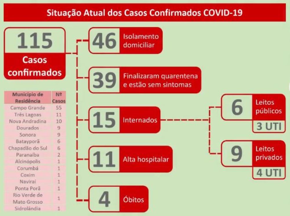 O boletim epidemiológico divulgado nesta terça-feira (14) pela Secretaria de Saúde de Mato Grosso do Sul (SES) revela que há 115 casos confirmados de coronavírus no Estado.