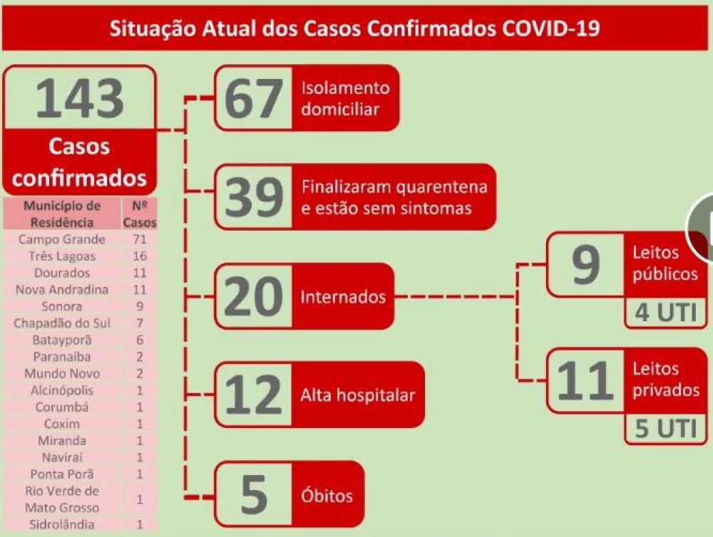 O boletim epidemiológico divulgado nesta sexta-feira (17) pela Secretaria de Saúde de Mato Grosso do Sul (SES) revela que há 143 casos confirmados de coronavírus no Estado.