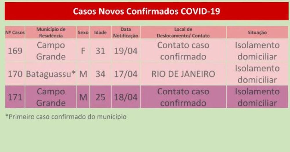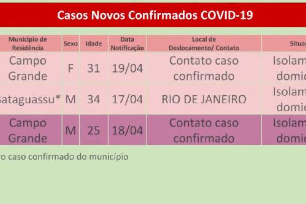 Os novos casos foram confirmados nas cidades de Campo Grande (02) e Bataguassu (1).