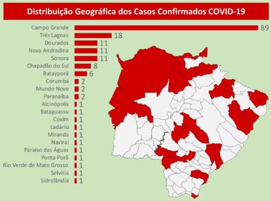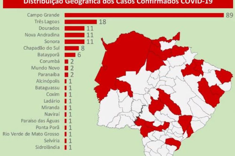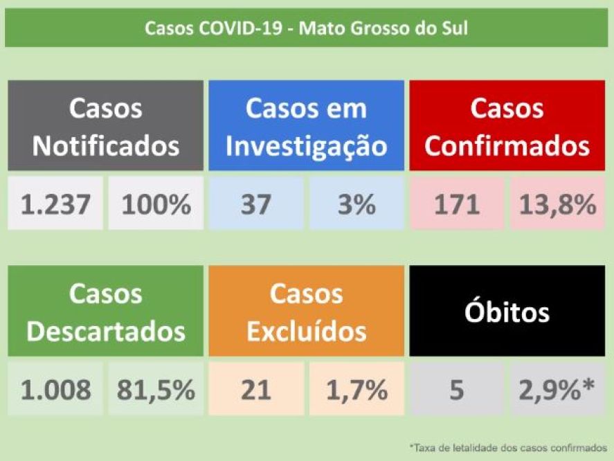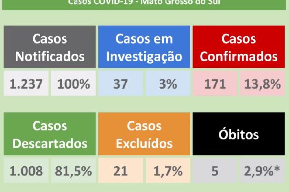 O boletim epidemiológico divulgado nesta segunda-feira (20) pela Secretaria de Saúde de Mato Grosso do Sul (SES) revela que há 171 casos confirmados de coronavírus no Estado.