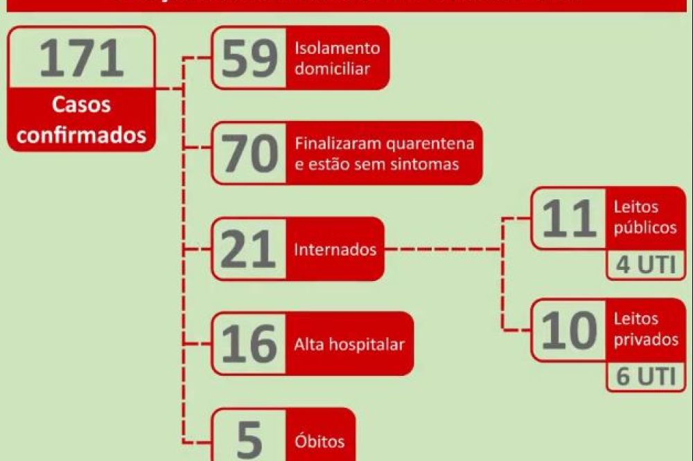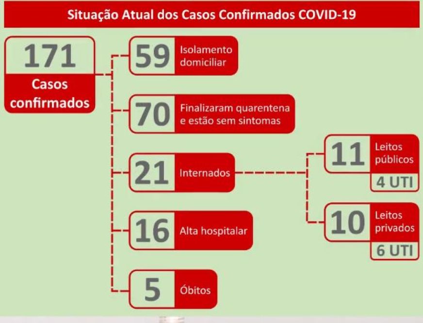 Do total de casos confirmados, 59 estão em isolamento social, 70 finalizaram a quarentena e estão sem sintomas, 21 seguem internados sendo 11 pacientes em leitos públicos e 10 pacientes em leitos privados, 16 receberam alta hospitalar. O Estado mantém 5 óbitos pela doença.