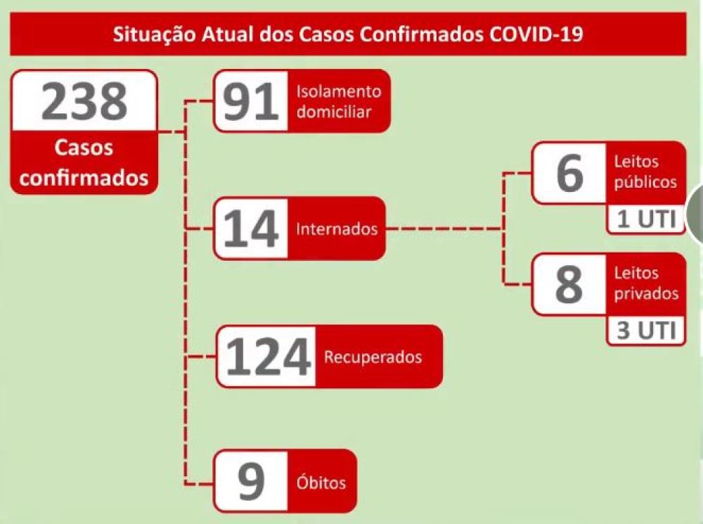 Do total de 238 casos confirmados, 91 estão em isolamento social, 124 finalizaram a quarentena e estão sem sintomas, 14 seguem internados sendo pacientes em 6 leitos públicos e pacientes em 8 leitos privados, receberam alta hospitalar. 04 pessoas seguem internadas em UTI, sendo 1 em leito público e 3 em leito privado. O Estado tem 9 óbitos pela doença.