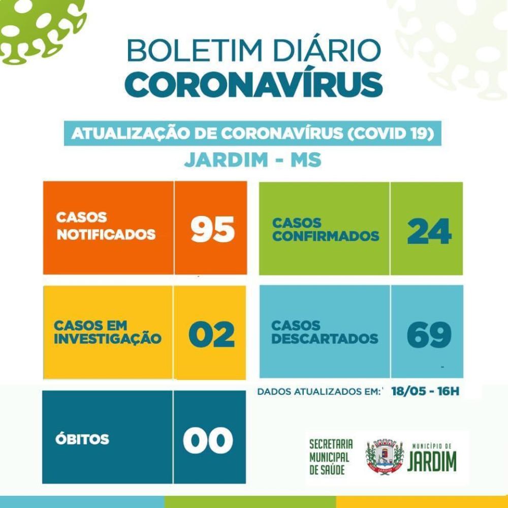 A Prefeitura Municipal de Jardim (MS) divulgou na última segunda-feira (18) boletim epidemiológico sobre a Covid-19. 24 casos foram confirmados na cidade.
