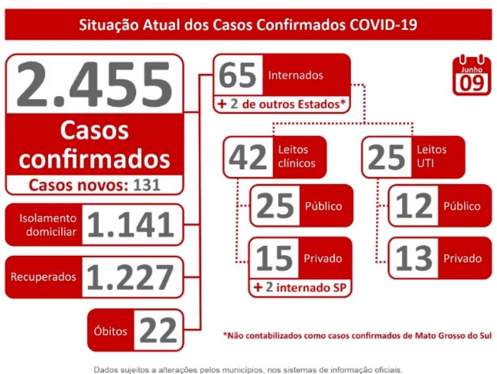 O boletim epidemiológico divulgado nesta terça-feira (9) pela Secretaria de Saúde de Mato Grosso do Sul (SES) revela que há 2.455 casos confirmados de coronavírus no Estado.