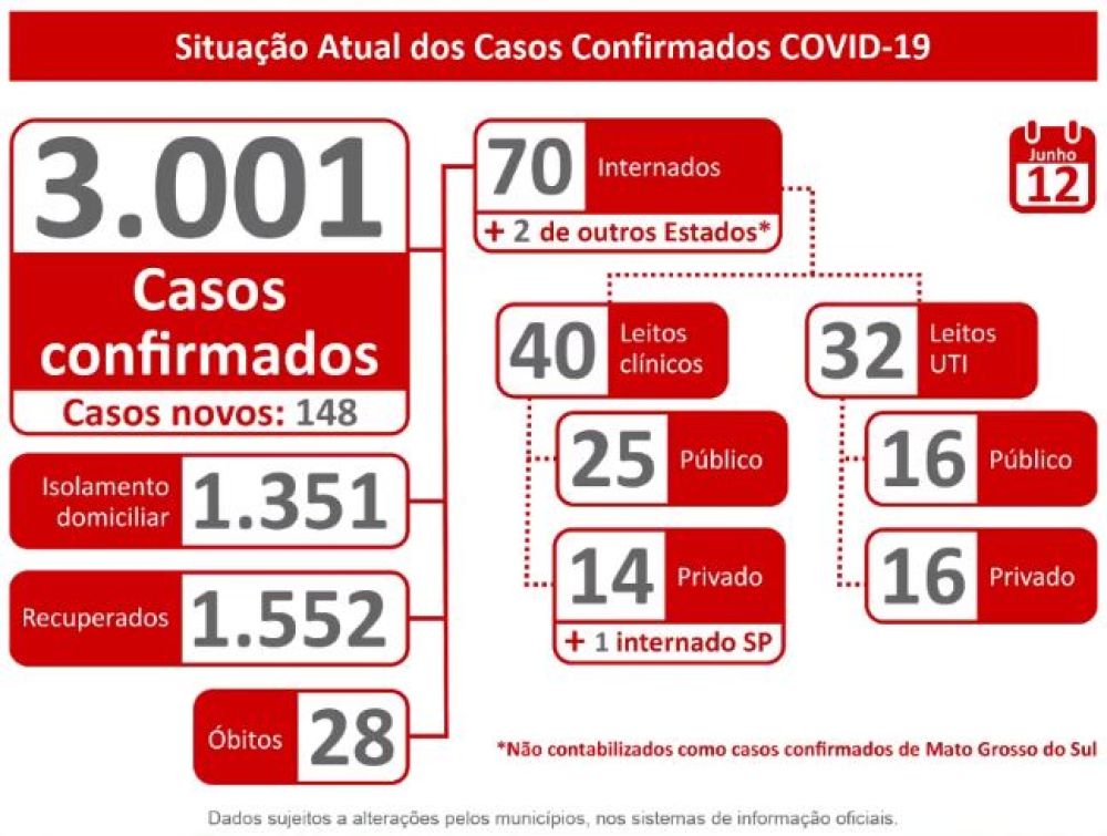 O boletim epidemiológico divulgado nesta sexta-feira (12) pela Secretaria de Saúde de Mato Grosso do Sul (SES) revela que há 3.001 mil casos confirmados de coronavírus no Estado.