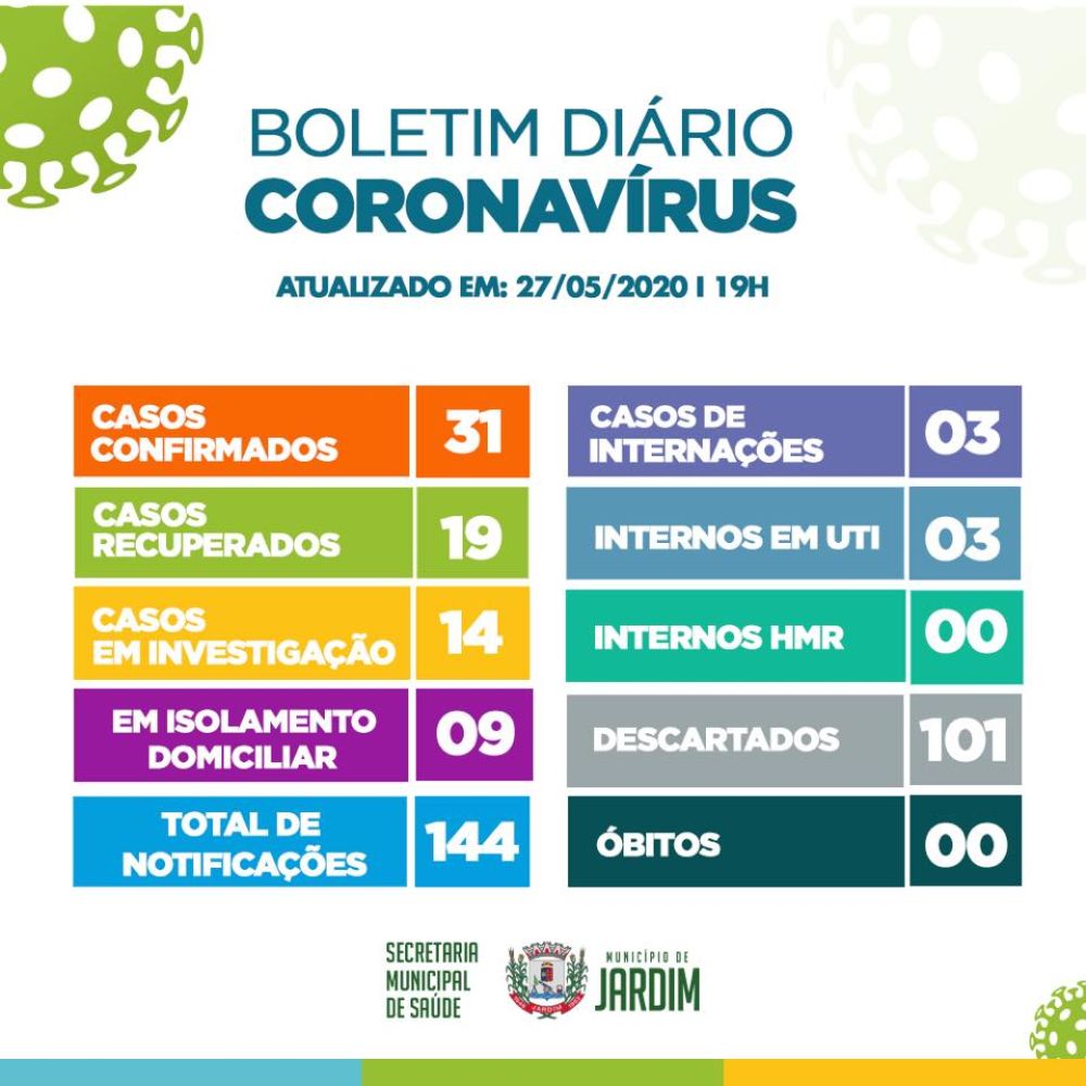 A Prefeitura Municipal de Jardim (MS) divulgou nesta quarta-feira (27) o boletim epidemiológico sobre a Covid-19, onde 31 casos foram confirmados na cidade.