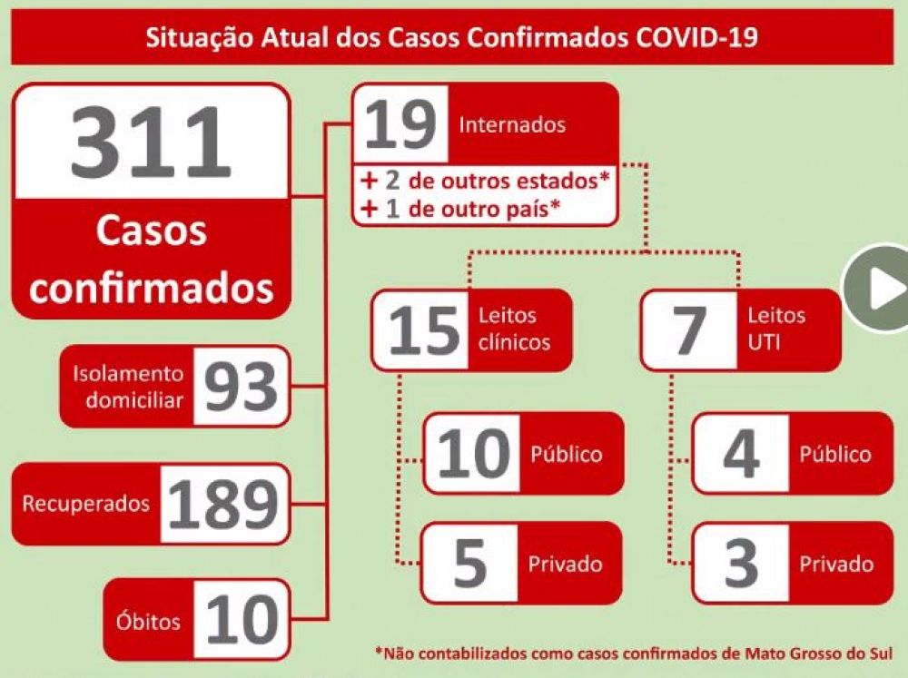 O boletim epidemiológico divulgado nesta quinta-feira (7) pela Secretaria de Saúde de Mato Grosso do Sul (SES) revela que há 311 casos confirmados de coronavírus no Estado.
