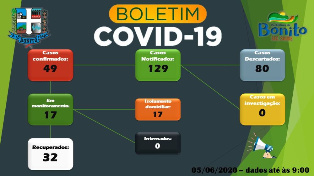 A Secretaria Municipal de Saúde de Bonito (MS) divulgou na manhã desta sexta-feira (5) o boletim epidemiológico sobre a Covid-19. Há 49 casos da doença confirmados na cidade, mesmo número registrado na quinta-feira (4).