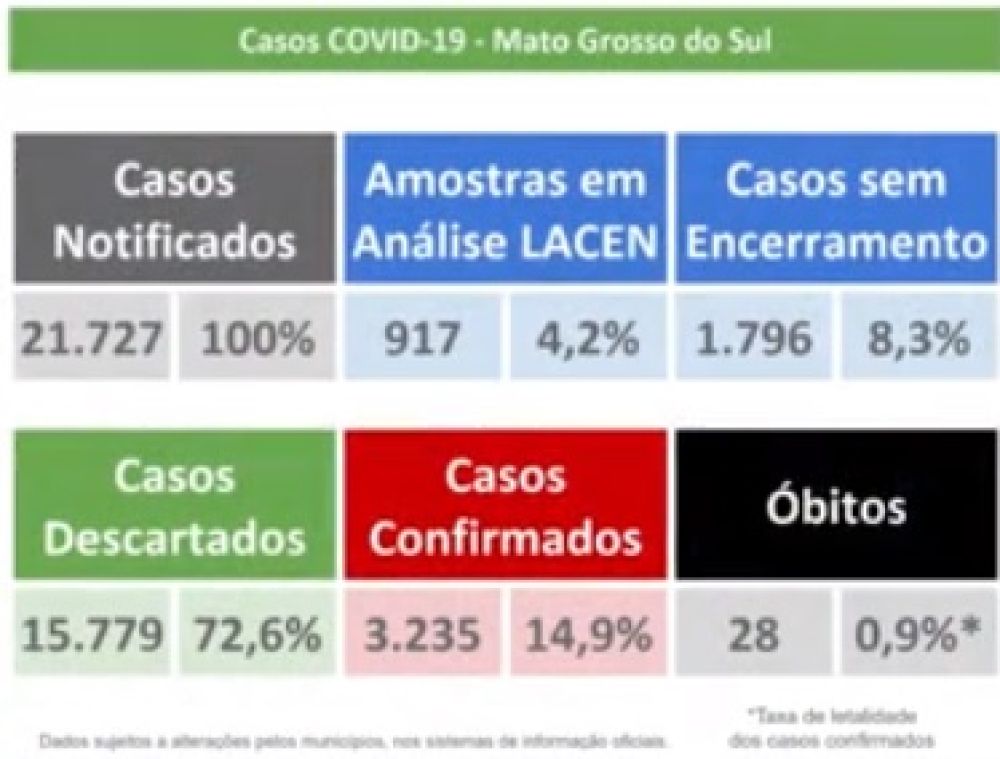 O boletim epidemiológico divulgado neste sábado (13) pela Secretaria de Saúde de Mato Grosso do Sul (SES) revela que há 3.235 mil casos confirmados de coronavírus no Estado.