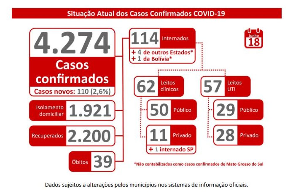 Dos 4.274 casos confirmados, 1.921 estão em isolamento domiciliar, 2.200 estão sem sintomas e já estão recuperados e 119 estão internados, sendo 79 em hospitais públicos e 40 em hospitais privados. Quatro pacientes internados são procedentes de fora do Estado e um paciente internado é de outro país.