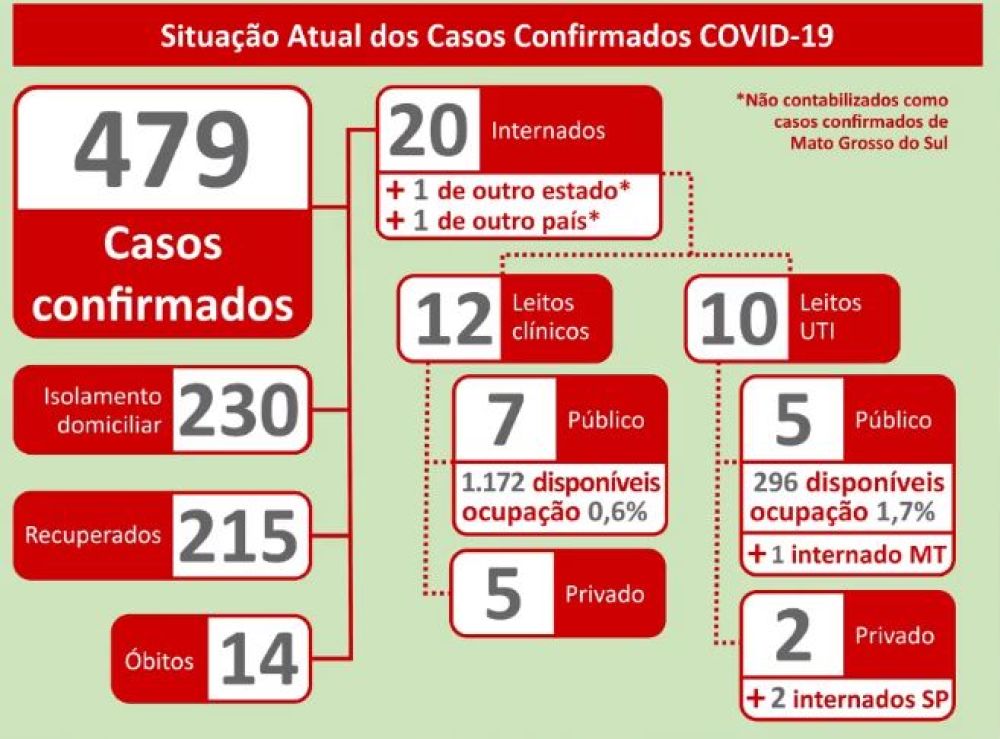 Dos 479 casos confirmados, 230 estão em isolamento domiciliar, 215 estão sem sintomas e já estão recuperados. 22 estão internados, sendo treze em hospitais públicos e nove em hospitais privados. Um paciente internados é procedente de fora do Estado e outro é de fora do País. Foram registrados 14 óbitos.