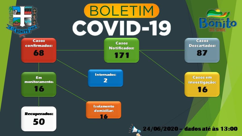 Dados divulgados pela Secretaria Municipal de Saúde de Bonito (MS) na quarta-feira (24), revelam que há 68 casos confirmados de Covid-19, sendo que destes 50 já estão recuperados.