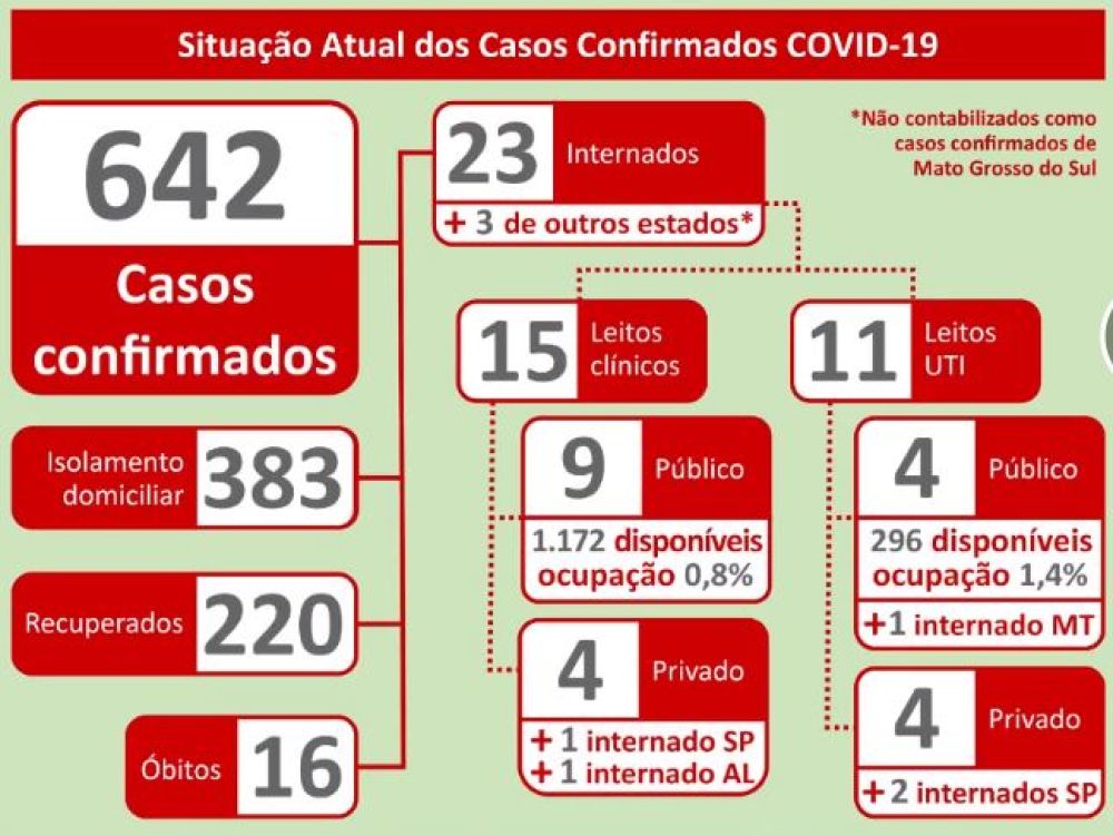 O boletim epidemiológico divulgado nesta terça-feira (19) pela Secretaria de Saúde de Mato Grosso do Sul (SES) revela que há 642 casos confirmados de coronavírus no Estado.