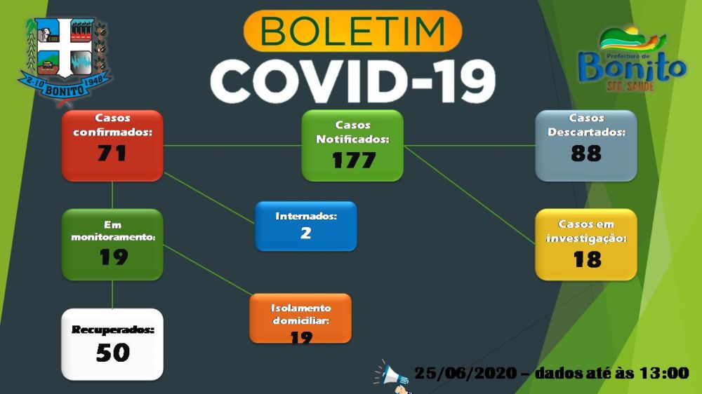 Dados divulgados pela Secretaria Municipal de Saúde de Bonito (MS) na quinta-feira (25), revelam que há 71 casos confirmados de Covid-19, sendo que destes 50 já estão recuperados.