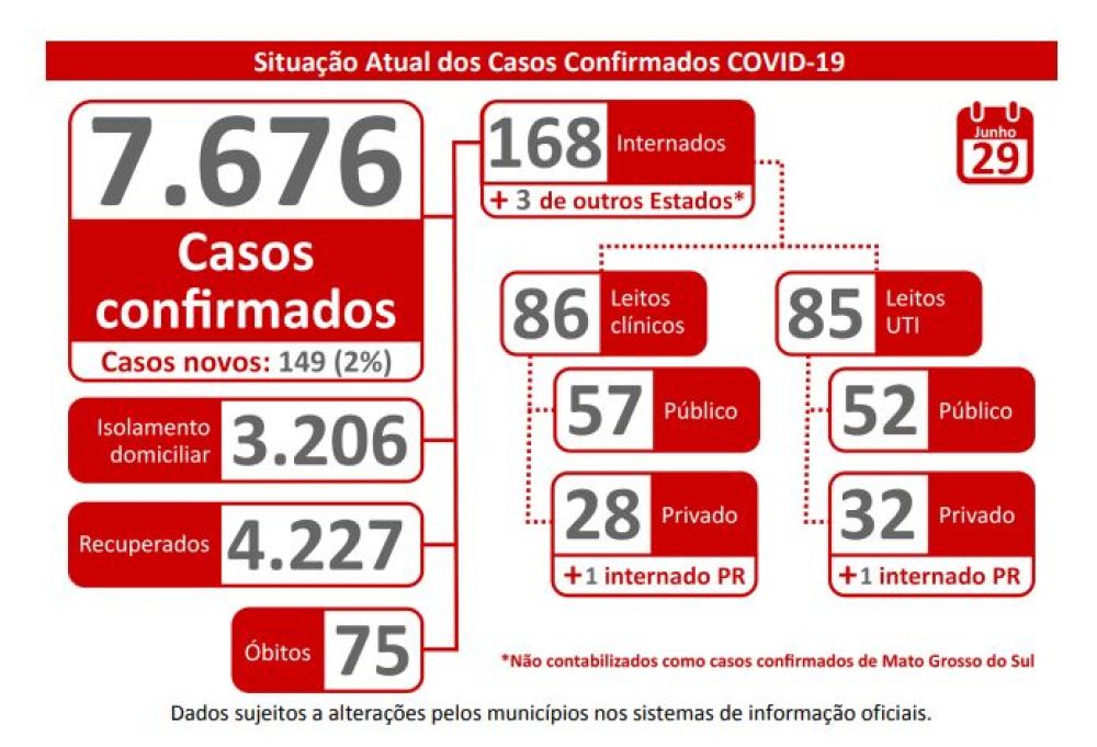 A Secretaria de Saúde de Mato Grosso do Sul (SES) transmitiu nesta segunda-feira (29) LIVE do boletim epidemiológico do Coronavírus (Covid-19). O Estado contabiliza 7.676 mil casos confirmados de coronavírus no Estado.
