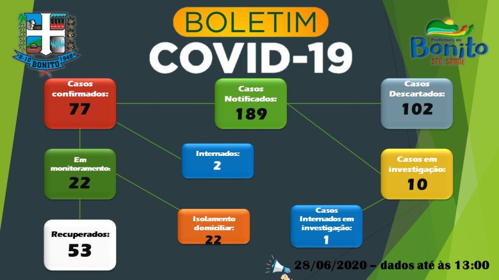 Dados divulgados pela Secretaria Municipal de Saúde de Bonito (MS) no domingo (28), revelam que há 77 casos confirmados de Covid-19, sendo que destes 53 já estão recuperados.