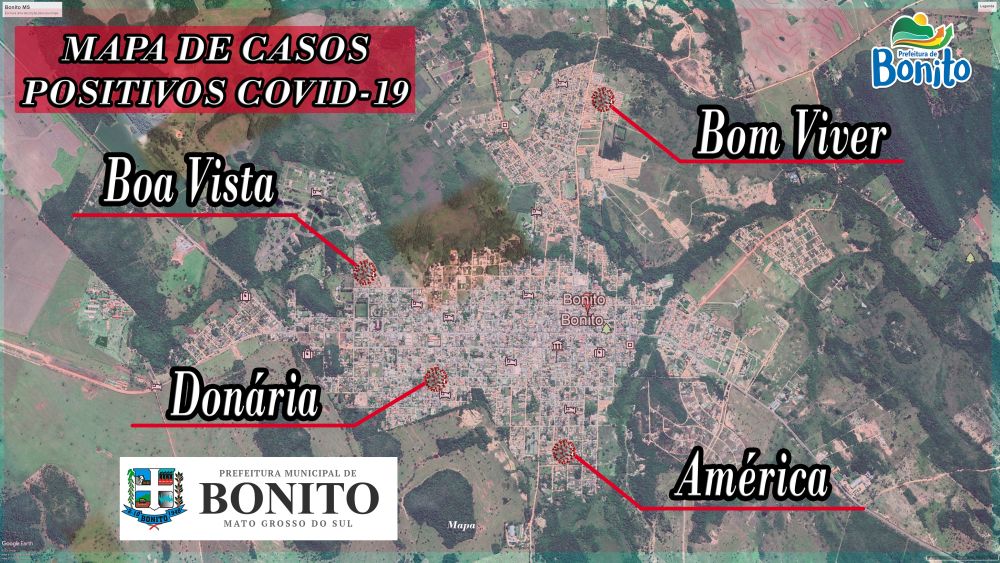 A Secretaria de Saúde de Bonito confirmou até esta segunda-feira (11) quatro casos positivos de Covid-19 (novo coronavírus), sendo um idoso de 81 anos, que já está em processo de cura, e três mulheres, de 24, 30 e 40 anos, funcionárias do frigorifico Franca Comércio de Alimentos. Os casos estão distribuídos em quatro bairros da cidade, conforme destacado no mapa ao lado.