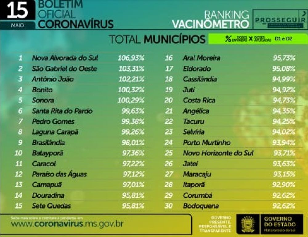 O município de Bonito apareceu em 4° lugar no vacinômetro da Secretaria de Estado de Saúde no último dia 15 de maio com 100,32% de pessoas já imunizadas. Segundo o Secretário Municipal de Saúde, Nivaldo Inácio Carneiro, essa é a prova do empenho e dedicação dos profissionais de saúde em cada imunização.