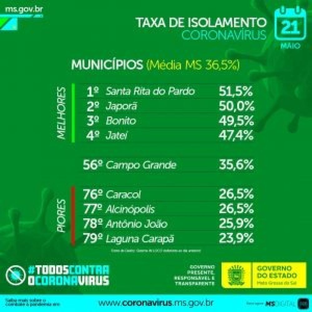 A adesão ao isolamento nos municípios com mais casos confirmados de Covid-19 foi de 35,6% (Campo Grande), 46,1% (Guia Lopes da Laguna), 39,1% (Três Lagoas), 39% (Dourados), 35,9% (Jardim) e 42,6% (Brasilândia). Já em Bonito, onde existe 16 casos positivos, sendo 1 curado e outros 15 com a mesma origem, o frigorifíco da cidade, o índice de isolamento fechou em 49,5%.